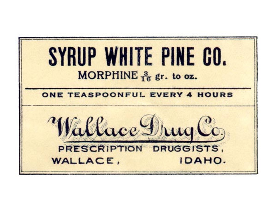 The bark of the White Pine Tree was used for the purpose of making Compound Syrup of White Pine with Morphine added. It created an Expectorant which was a useful remedy for coughs and colds. It also had a beneficial effect on the bladder and kidneys. The syrup containing 3/16 gram of morphine has long been said to have contributed its share towards cultivating the morphine habit. This label measuring 2.5” Wide x 1.5” High is from the Wallace Drug Company of Wallace, Idaho.