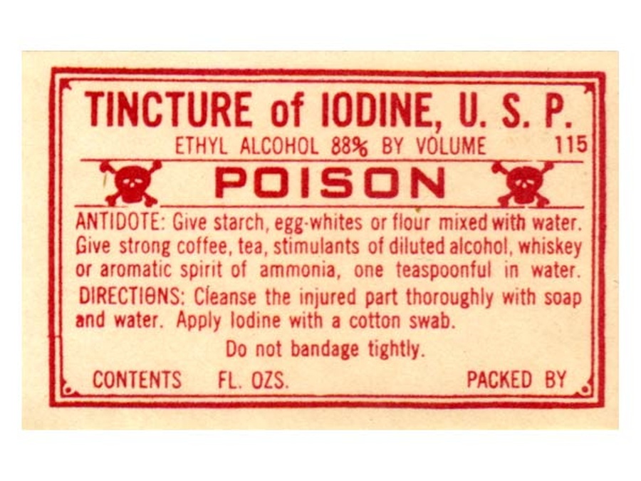 This poison label features dual skulls and crossbones to indicate that it is poisonous. It was commonly used to disinfect wounds and sanitize drinking water for consumption. It is a solution of iodine in ethyl alcohol and the label measures 2” Wide x 1.25” High. This preparation used 88% alcohol. The antidote for Tincture of Iodine was listed as a mix of starch, egg whites of flour mixed with water. This label is in mint unused condition.