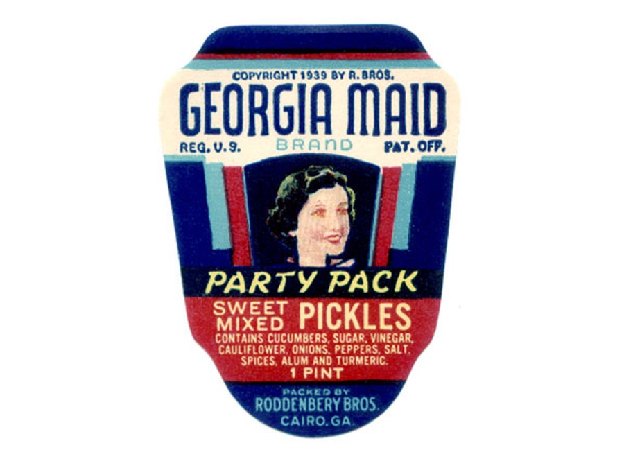 This Georgia Pickle label is from the Roddenbery Brothers in Cairo, Georgia. By the way, if you're from South Georgia that's pronounced “Kay_Row”. The label dates back to 1939 and has an image of a pretty woman in the center. It was for the Party Pack of Sweet Mixed Pickles which included cauliflower, onions, and peppers in addition to the cucumbers. This vintage label went on a 1 pint jar and measures 2.3” High x 1.75” Wide in mint condition.