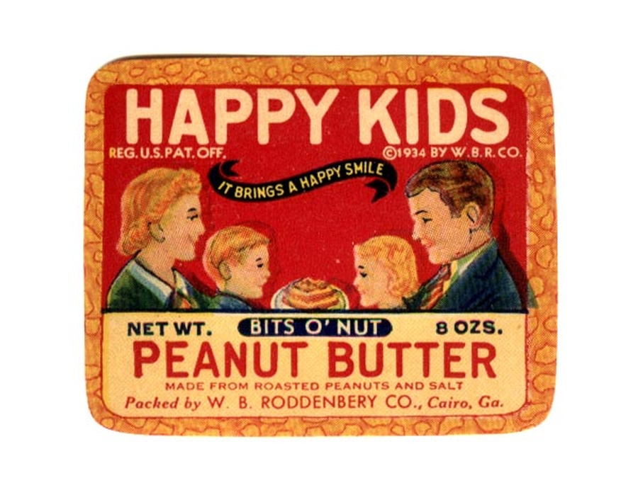This Happy Kids Peanut Butter, with Bits O’ Nuts, label is from the W.B. Roddenbery Co. in Cairo, Georgia. By the way, if you're from South Georgia that's pronounced “Kay_Row”. The label dates back to 1934 and has a great image of the family enjoying their Happy Kids peanut butter. This label went on an 8 oz. jar and measures 2.15" Wide x 1.75” High in unused near mint condition.