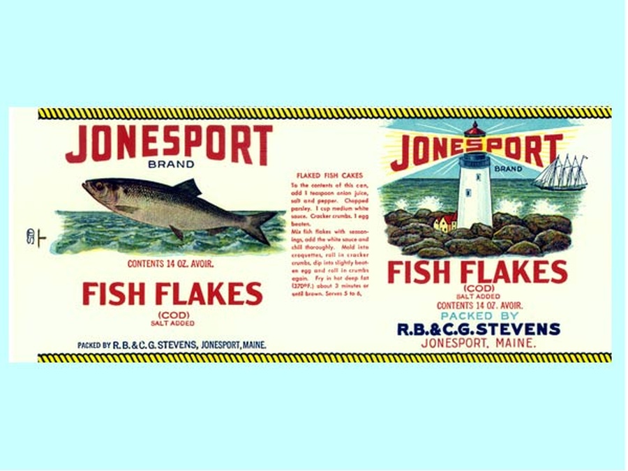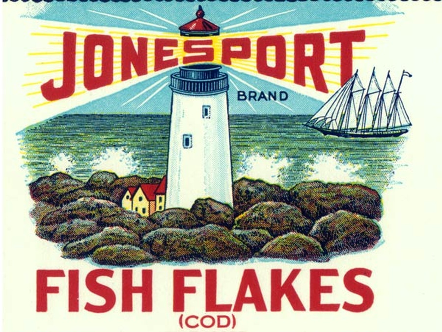 Our Jonesport Fish Flakes label is a great piece of memorabilia as a well as a nice decorator item framed for your kitchen or office. The label features an image of a cod floating above the ocean on one side, and a lighthouse on a rock outcropping with the water splashing against it and a sailing ship in the background, on the other side. Simpson-Doeller of Baltimore, Maryland printed the label for R.B. & C.G. Stevens Company of Jonesport, Maine, who was the packer. It measures 9-3/4" Wide x 4-1/8" High and since it is early offset printing, probably dates to the late 1920s.
