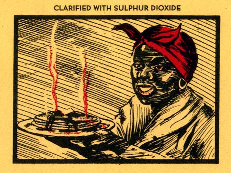 This vintage syrup label went on a 3 quart, 4 ounce container and not technically on a crate. That in no way detracts from the value or beauty of this label. The label measures 8” Wide x 6.4” Tall and dates to the 1930s. It features a picture of a black Aunt Jemima like mammy with a red bandana carrying a stack of pancakes, against a yellow gold background. Longwood Plantation’s pure cane syrups were produced in a variety of sizes, this being the largest.