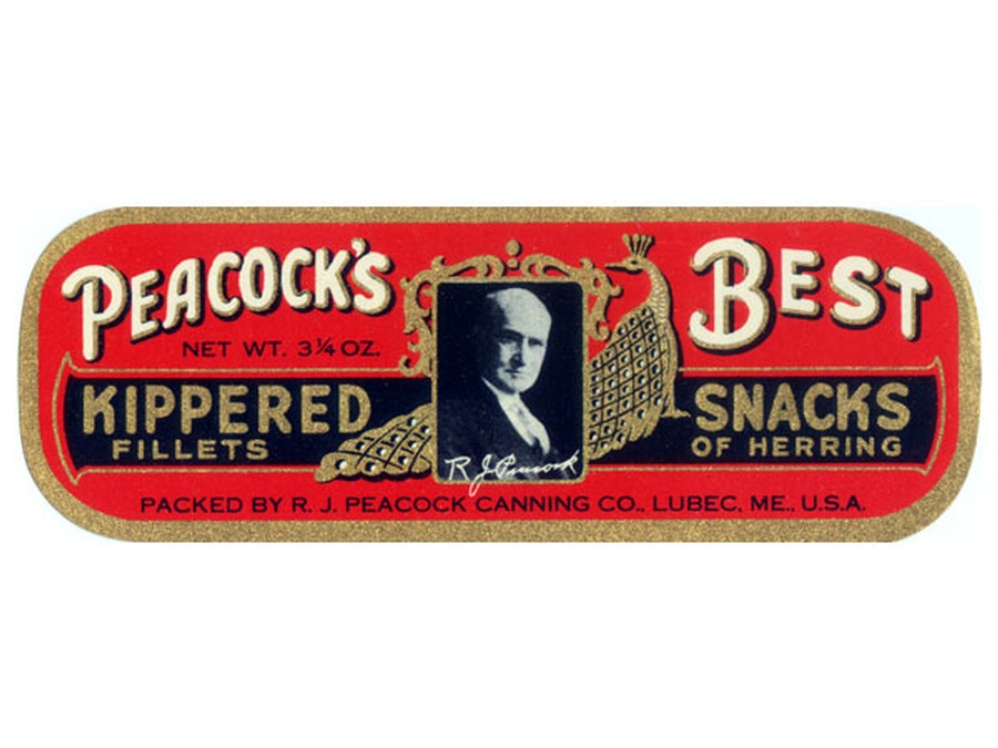 This label measures 5.25” Wide x 1.8” High with gilded edges in mint unused condition. It is packed by the R.J. Peacock Canning Company of Lubec, Maine and features a picture of Mr. Peacock.