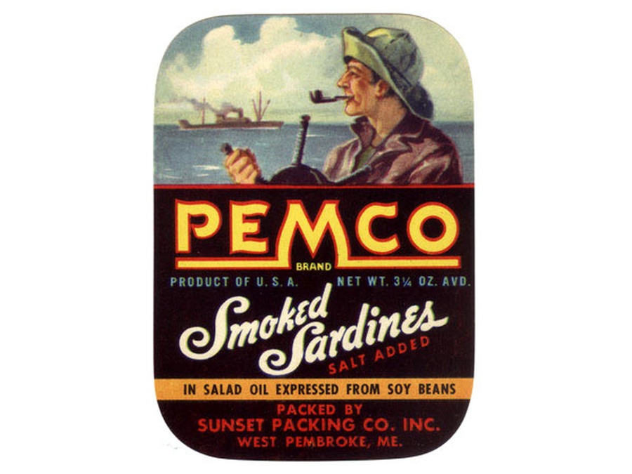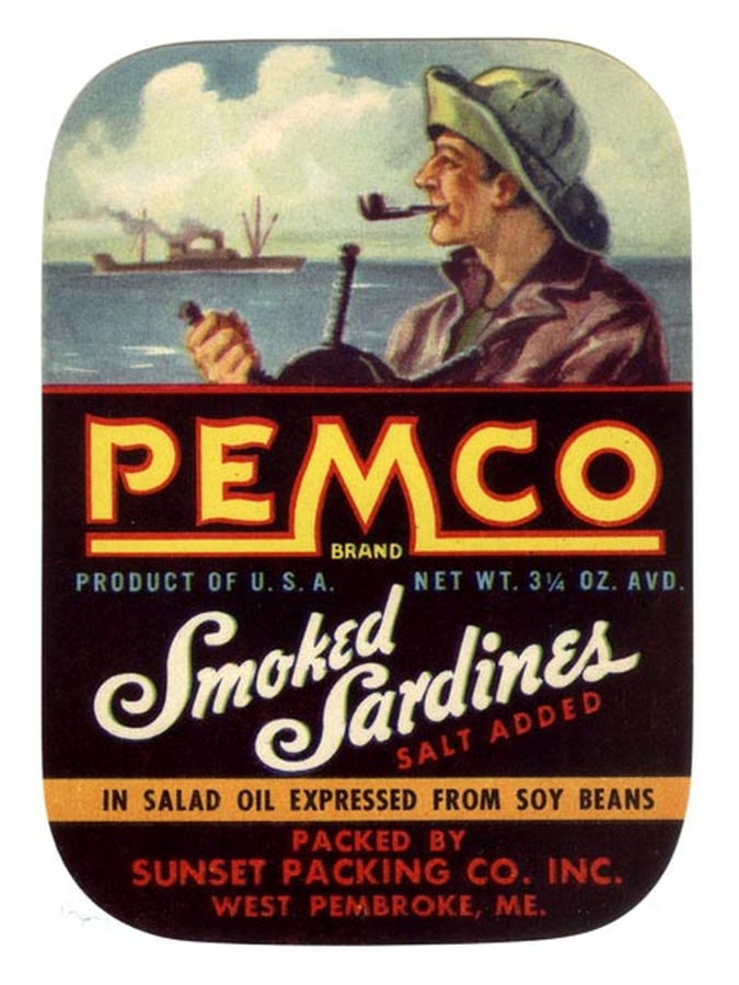 This 4" Tall label was found at the Sunset Packing Company warehouse in West Pembroke, Massachusetts. The label has a sailor in foul weather gear smoking a pipe with bright colors and nice details.