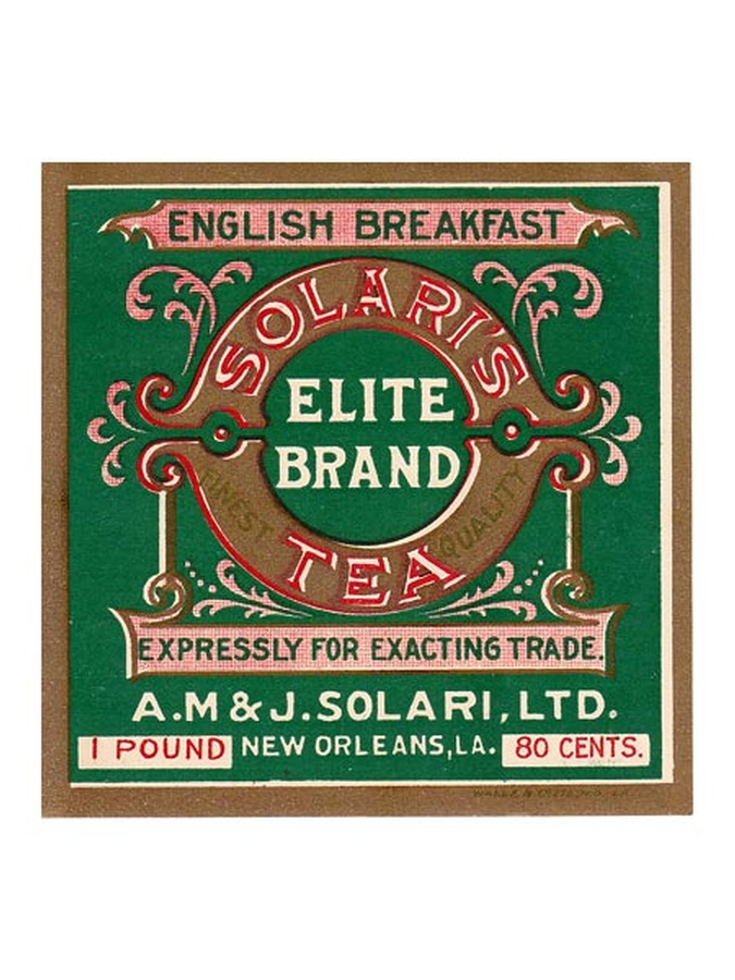 This Solari's Elite Brand Tea label measures 4.4" Wide x 4.5" Tall and went on a one pound package of English Breakfast Tea. This was Solari's private brand and we think the label was printed by Walle Printers of New Orleans, Louisianna, and dates back to the 1920s. You can tell that it was a coveted brand since the price for this one pound package was a hefty $.80.