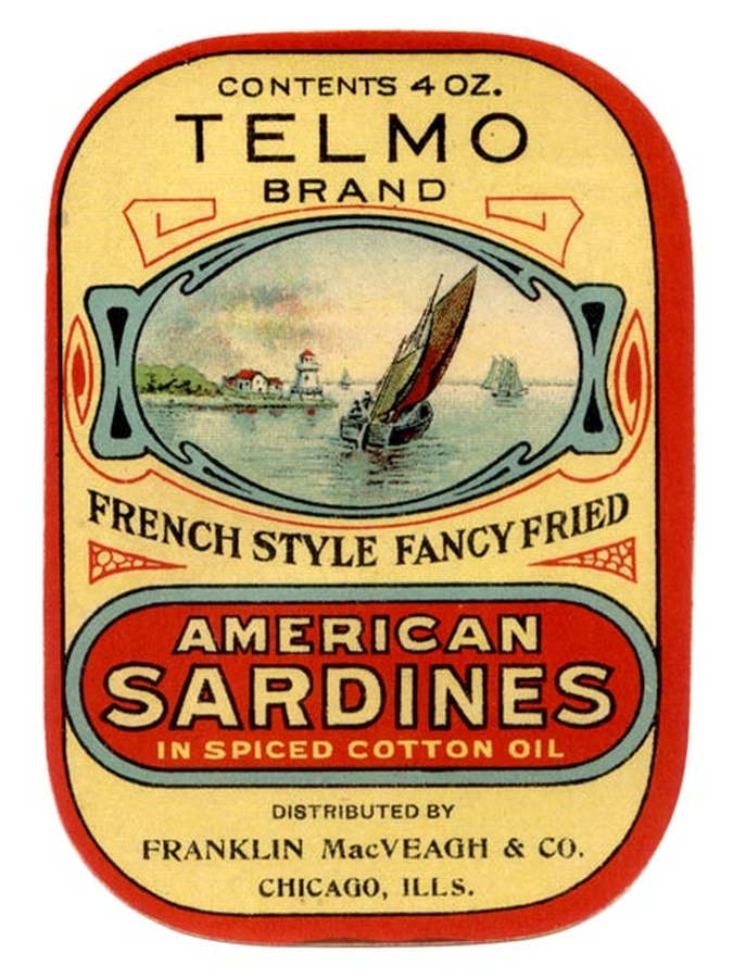 This is a great unusual label. After all, how many tins of French Style Fancy Fried Sardines have you seen? This almost 100 year old label has great saturation of colors with wonderful Deco line work and curved text. It measures 2.875” Wide x 4.2” Tall featuring a sailboat headed out to sea past a lighthouse and went on a 4 ounce tin of sardines. The sardines were distributed by Franklin MacVeagh & Company of Chicago, Illinois. This label was discovered in a barn near an old factory site in Maine.