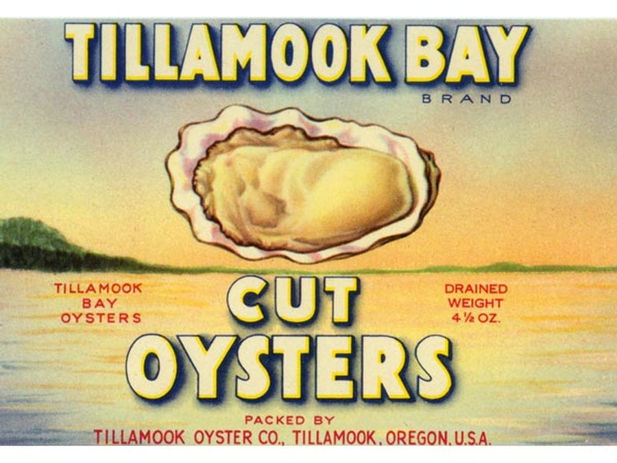 This oyster can label from the 1930s measures 8.75” Wide x 2.7” High and features a beautiful image of Tillamook Bay with a couple of boats and the land in the background. There is also an image of a fresh oyster on the half shell in the center of the label. The label was lithographed by the Ridgway Lithograph Company of Portland, Oregon. The oysters were grown, harvested, and packed by the Tillamook Oyster Company of Tillamook, Oregon.