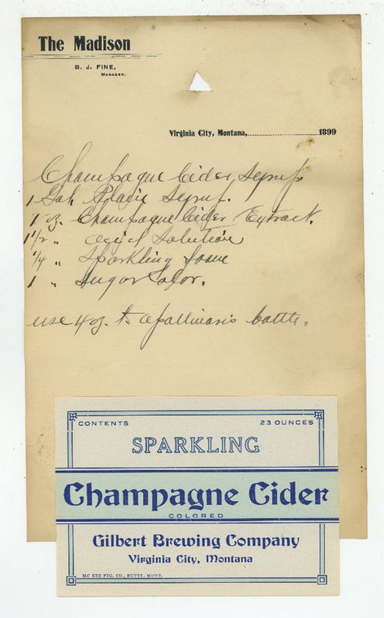The Gilbert Brewing Company is Montana's oldest brewery and began in 1863, less than a month after gold was discovered in Alder creek. It brewed beer with fresh spring water and aged at a cool temperature by routing the cool creek water through the aging room. The town grew rapidly and by the end of the year the brewery was in the heart of a booming town called Virginia City with 7,000 thirsty miners. The first ingredient used to brew beer was sage brush since supplies were hard to come by. They moved to traditional ingredients and Gilbert Beer was proclaimed by authorities to be among the best in the country. It was a profitable business until 1916 when Montana joined the prohibition movement. The brewery continued brewing but turned to non-alcoholic beverages such as Bromo Pop, Ironbrew, cream soda, root beer, strawberry soda, and ginger ale. The recipes, I guess were made in small batches before 1916, since we have a copy of the recipes dated 1899 (see photo). Unfortunately, these products did not generate enough revenue to survive the tumultuous times and the brewery ceased operations and closed its doors in 1934.