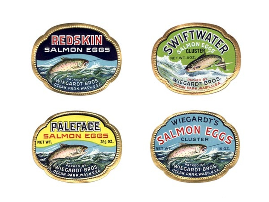 These original unused Salmon Egg labels date back to the 1920s. They are embossed, gold edge gilded, and frankly just beautiful. There are a total of four (4) labels in the collection, each measuring 2.5” Wide x 2” High. They represent the four brands of Swiftwater, Redskin, Paleface, and Wiegardt’s Salmon Eggs Cluster. They were packed by Wiegart Brothers of Ocean Park, Washington.