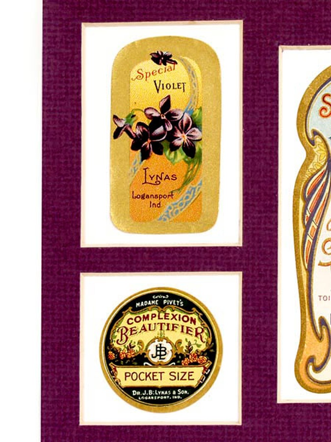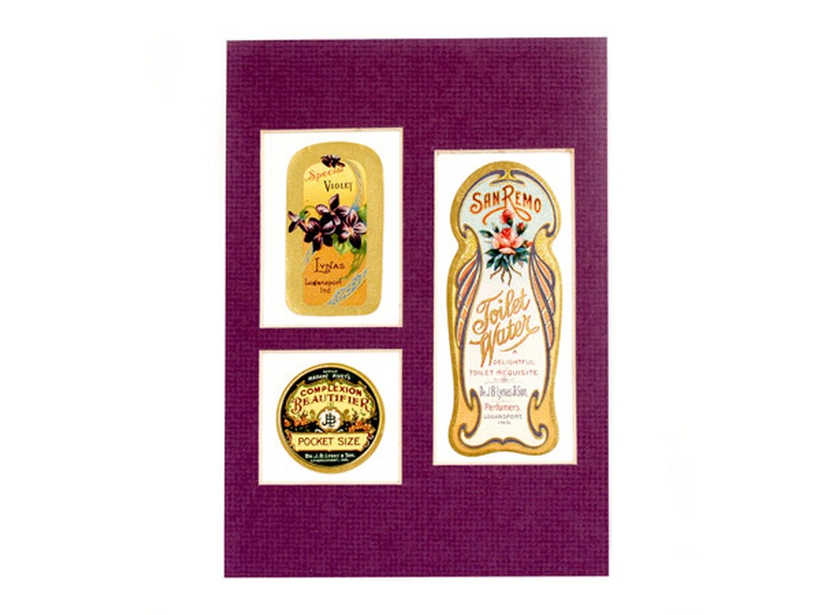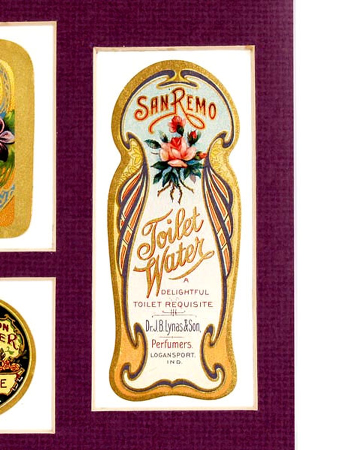 Frankly, this set of labels is even more beautiful than we expected. Setoff by the light purple matte that picks up the pastel colors, they are just magnificent to look at. This set is composed of three beauty labels from J.B. Lynas & Son from the 1910s – 1920s. The larger label is San Remo Toilet Water. It measures 3.75" Tall x 1.5" Wide with beautiful pastel colors and a pink rose. The circular label is a pocket size Madame Pivet’s Complexion Beautifier measuring 1.5” in diameter. Completing the set is Special Violet featuring purple violets and measuring 2.25” Tall x 1.25” Wide. It’s the perfect set.