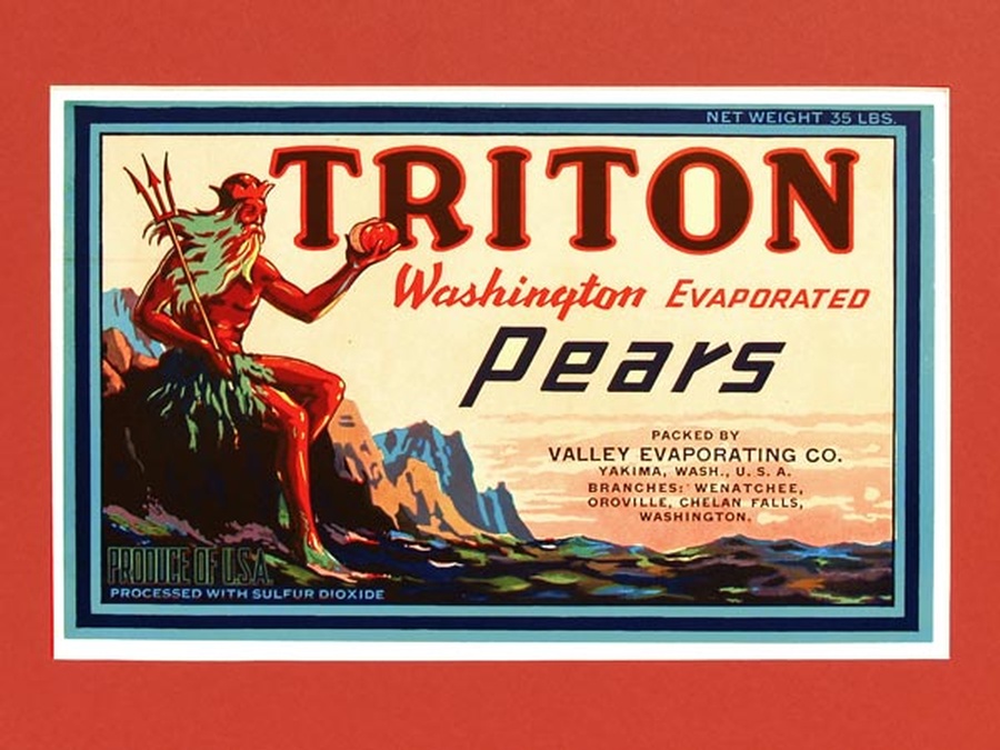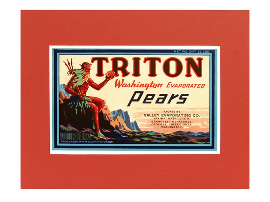 This 1930s – 1940s vintage vegetable crate label for evaporated pears shows the sea god King Neptune with a triton in one hand and fruit in the other. He is shown at sunrise sitting on a rock and admiring his Washington State Fruit. The label measures 10” Wide x 6.25” High and is in mint unused condition. The fruit was packed and shipped by the Valley Evaporating Co. in Yakima, Washington. They had branches in Wenatchee, Oroville, and Chelan Falls, Washington.