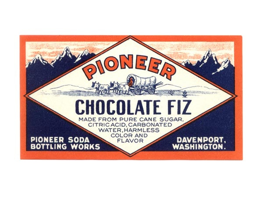 This fascinating soda label was found at the Pioneer Soda Bottling Works in Davenport, Washington. The label measures 4” Wide x 2.25” High and is from the 1920s. It has a great drawing of a Conestoga wagon with a pioneer driving four oxen. Apparently they are headed west. This mint unused label will make a great addition to your collection and when have you ever seen Chocolate Fiz Soda. Also check out our other Pioneer Sodas for a great grouping.
