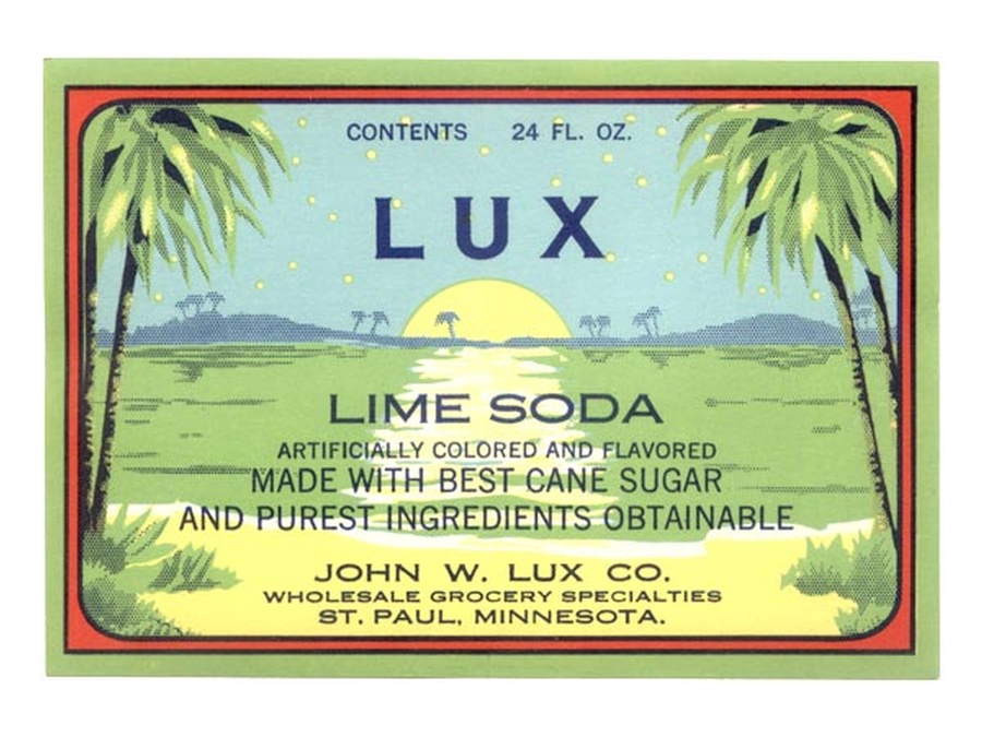 This vintage label for LUX Lime soda went on a 24 ounce bottle and measures 4.5” Wide x 3.25” High. The soda was produced by the John W. Lux Company of St. Paul, Minnesota. They were a wholesale grocer located at 484 Rice Street in St. Paul and originally began operations before 1900. We think this label dates to the 1940s or earlier.